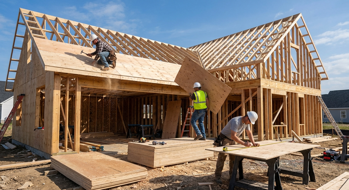 Where structural bracing is required and 7/16" OSB is insufficient, 19/32" plywood wall sheathing is specified for higher wind and seismic zones. It provides better nail withdrawal strength and racking resistance than thinner alternatives.