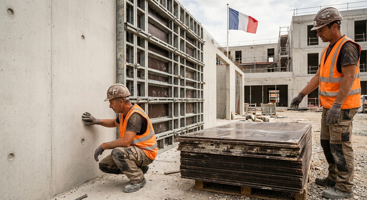 En France, les normes NF EN reprennent intégralement les normes européennes. Les exigences françaises n'ajoutent pas de critères supplémentaires pour les panneaux de coffrage, mais les DTU (Documents Techniques Unifiés) encadrent la mise en œuvre du coffrage sur chantier.